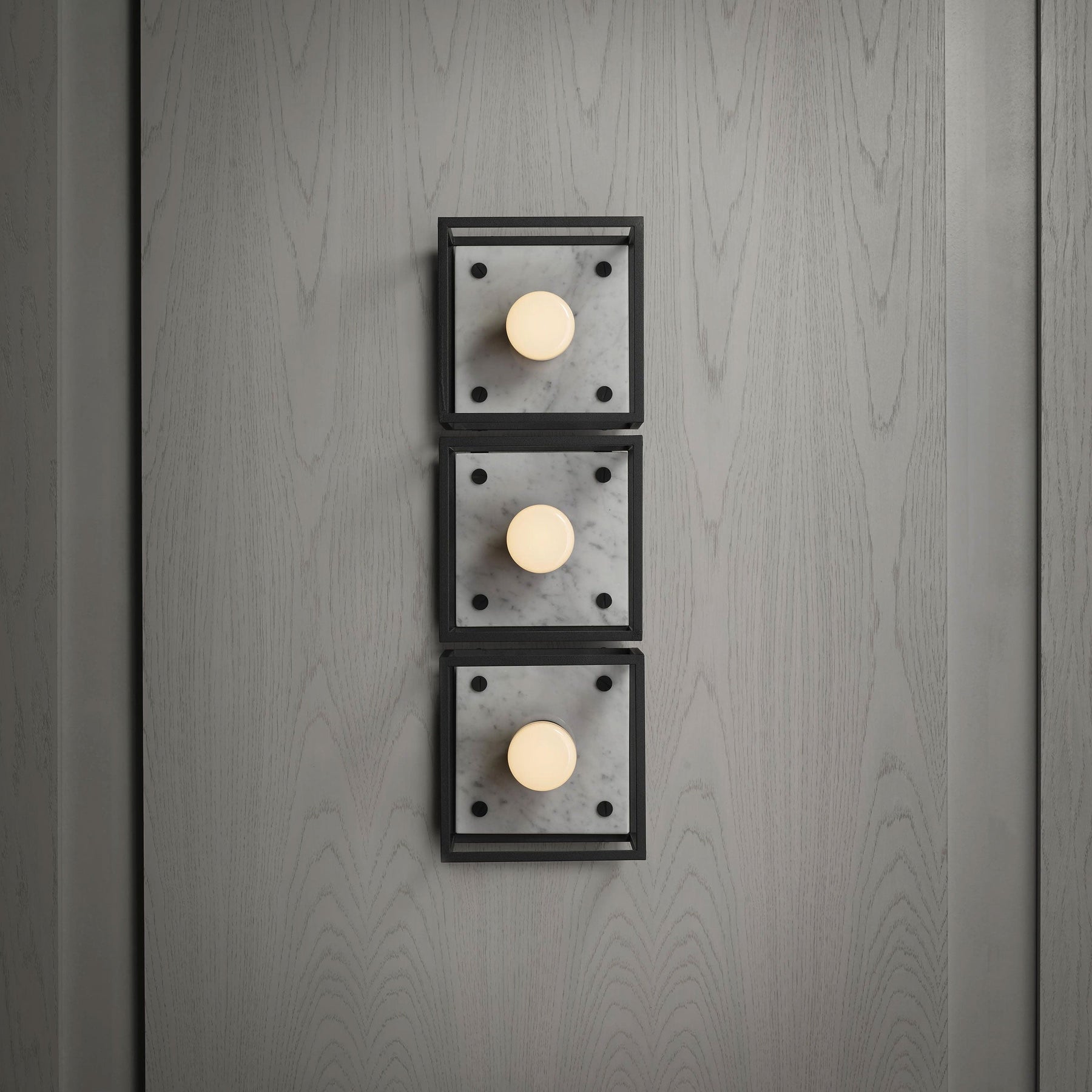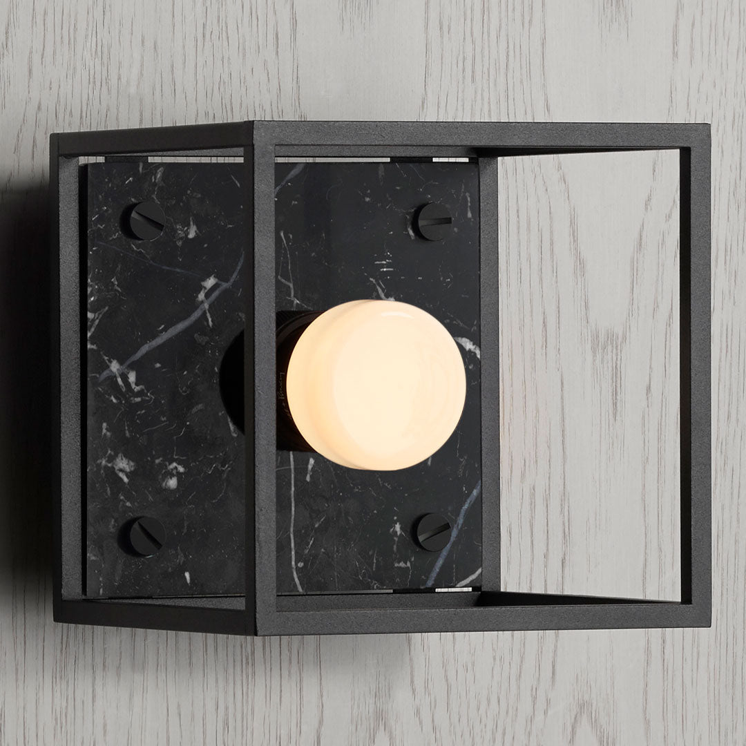 Caged wall small shows off the LED Punch Bulb. It's compact size makes the light easy to fit in rooms of all sizes. The light is made from a matte black metal cage that comes with a changeable back panel. Caged Wall/Small can be combined with other CAGED lights to create large scale arrangements. 6.7" high.