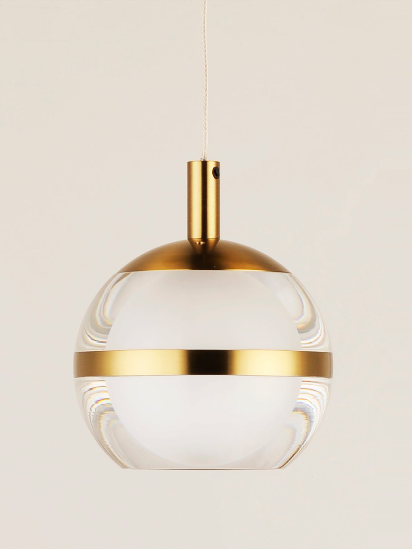 Orbs of crystal Clear acrylic are trimmed with a brass metal band and frosted inside for excellent light diffusion. The bottom is dimpled for a unique optical effect. Integrated, dimmable LED mini pendant.