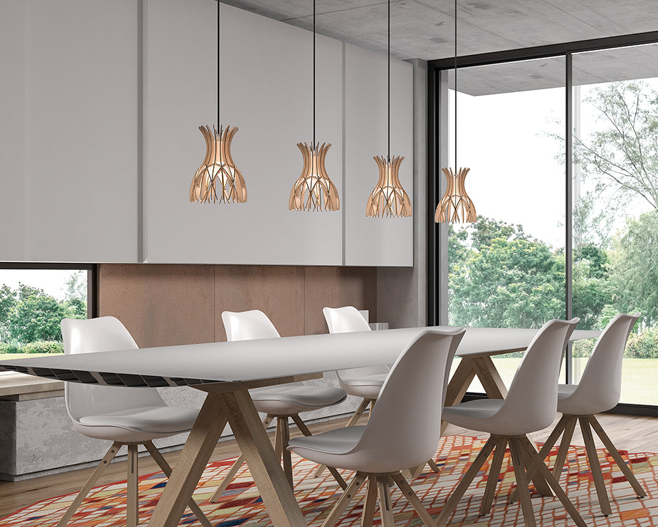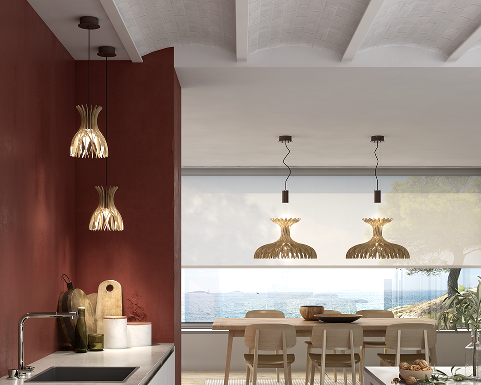 There are two possible positions for the pendant collections: Starting from a central canopy, we can redraw with the electric cable the forms that we want in the ceiling and / or wall, just moving the cable away from the natural verticality of the canopy and driving it through a small metallic support that, at the same time, guides the cable and, in extension, also the screen. The second option allows us, from a central canopy, to drop the screens naturally as a cascade pendant lights.
