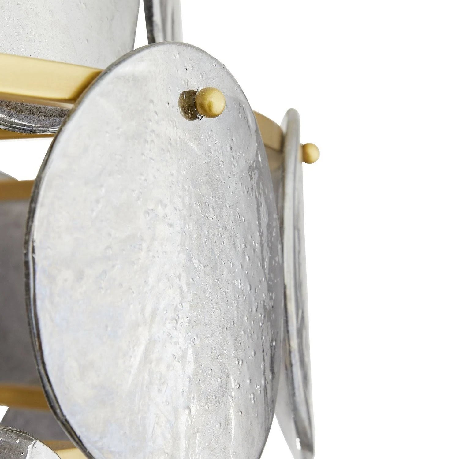 Large, circular slumped seedy glass panels in a smoke finish are fastened to a tiered, concentric antique brass steel frame. When lit, the light delivers a soft sheen to the moody hue of the glass, further enhancing its natural composition