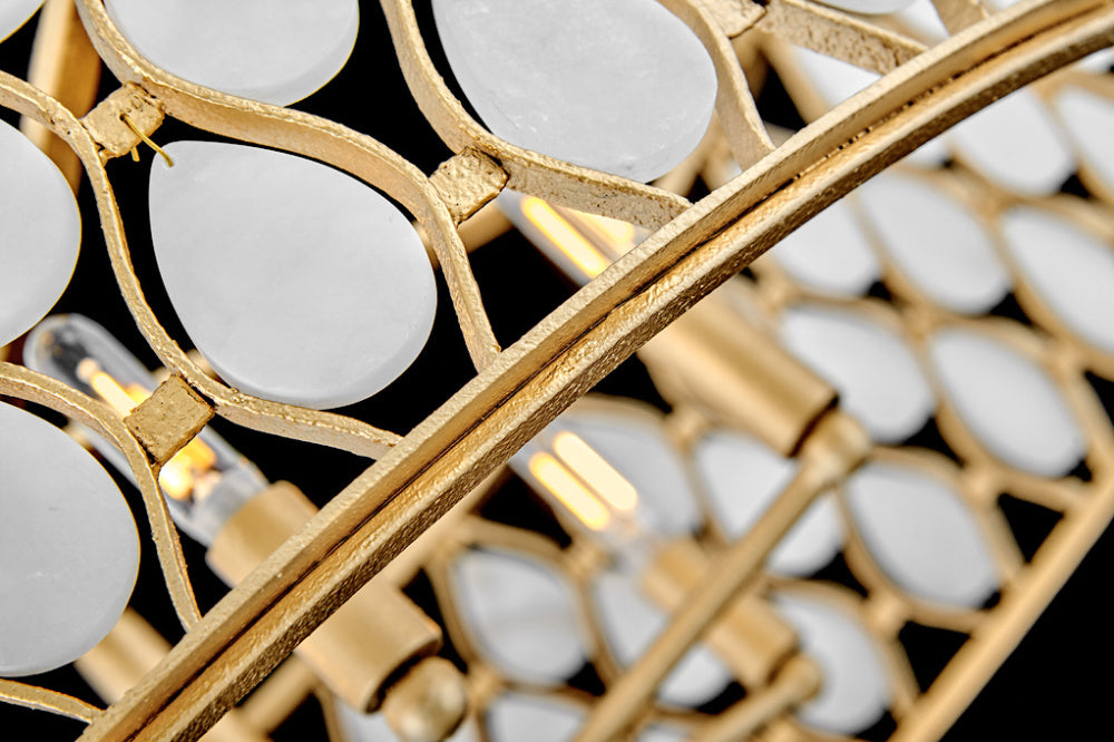 Opulently adorned with natural alabaster stones held within a traditional latticework shade, Estie brings organic elegance to any décor aesthetic. Intricately curved metalwork complements the frame, chain, and canopy in a textured, hand-painted Piastra Gold finish